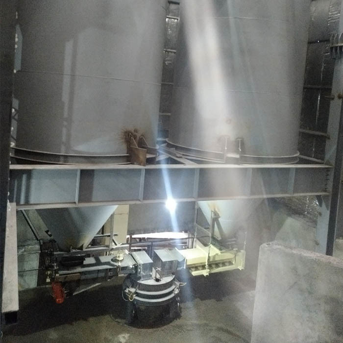 - Após a pesagem, cada material é enviado para o misturador, existem dois misturadores, um trabalho e um em espera, em seguida, após a mistura no misturador, os materiais em lote são enviados para o forno por transportador.