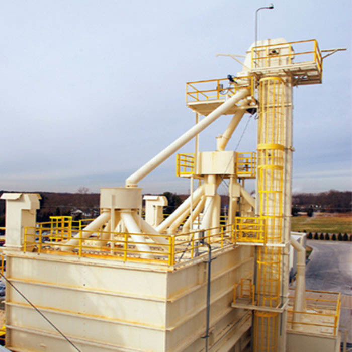 O misturador, as escalas e os silos são arranjados verticalmente.